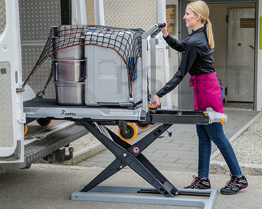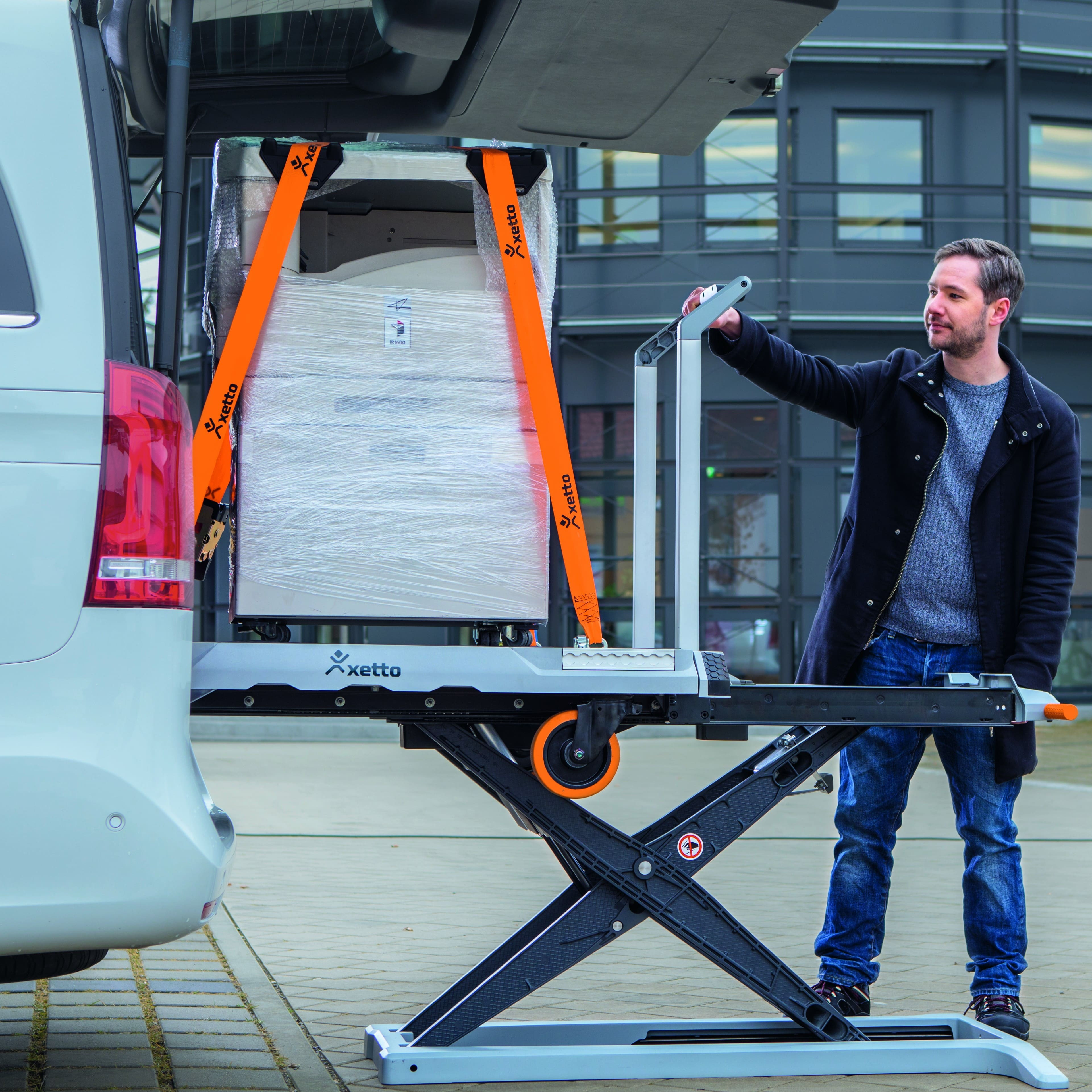 Loading of goods from a height of more than 1 meter onto Xetto® is not an issue. The load area that is firm and adjustable in height enables you in loading and unloading Xetto flush with the surface.
