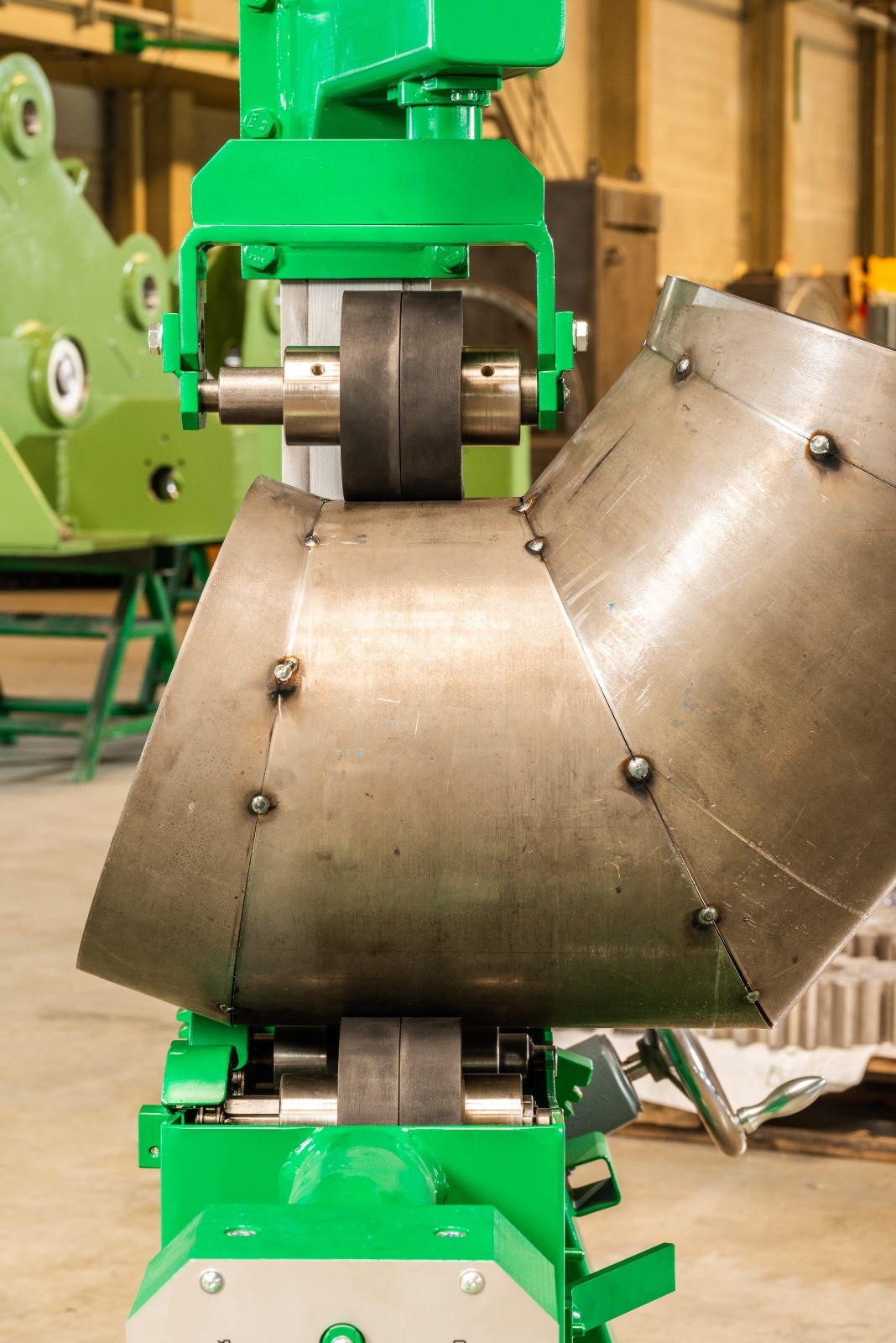 The frame-integrated tilting mechanism provides a 135° tilt angle. This function can be operated manually on the U 150 and U 500 models, while on the U 1000 model, it is available as an option on the U 500. The tilting mechanism includes a holding column, clamping arm, drive and roller box, and a pressure roller.