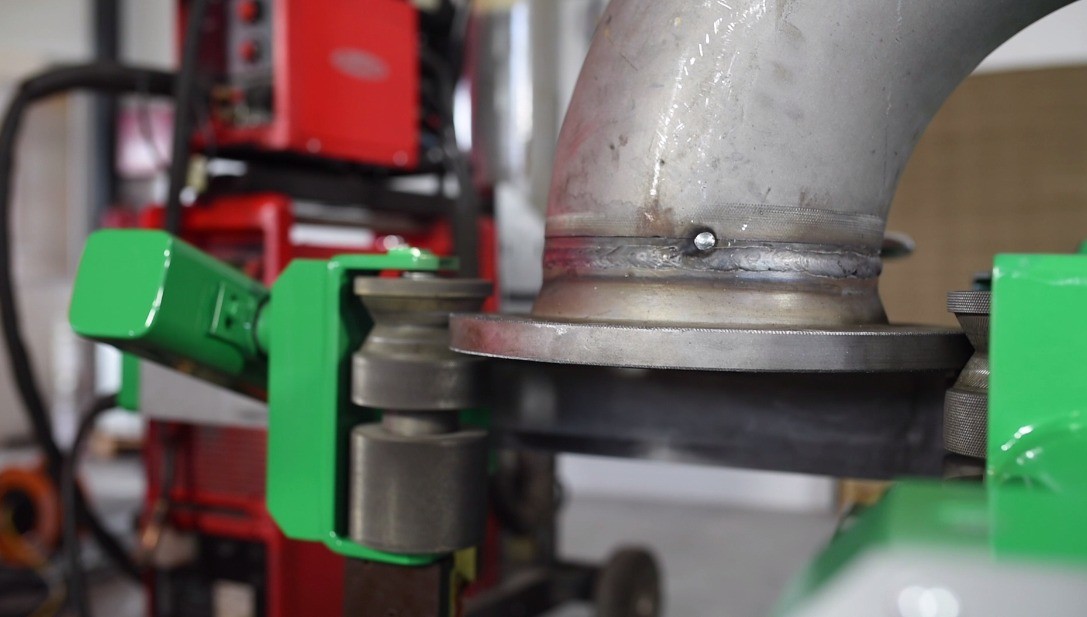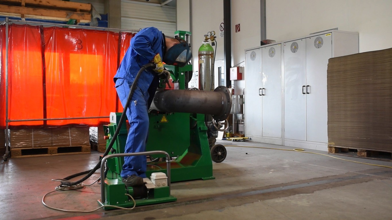 The welder operates the power and rotation direction of the machine through a helmet or shield-mounted control system. The rotation speed of the machine is pre-set.